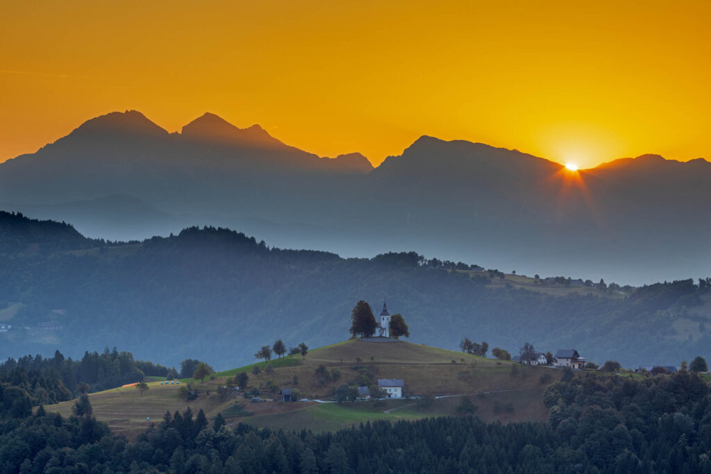 Fine art print of Mid summer view at sunrise across to Sveti Tomaz nad Praprotnim (church of Saint Thomas) and the Kamnik Alps